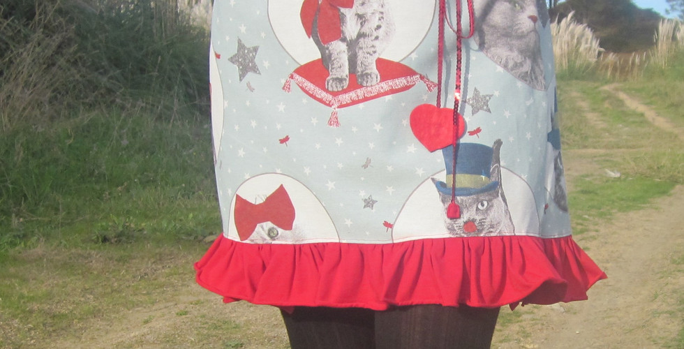 Para este look vamos a combinar Falda Gatos traviesos la cuál tiene unos detalles divinos. Un bajo muy chulo en forma de volante rojo y un corazón afieltrado que pende de una tira de lentejuelas rojas. ¡Love!
